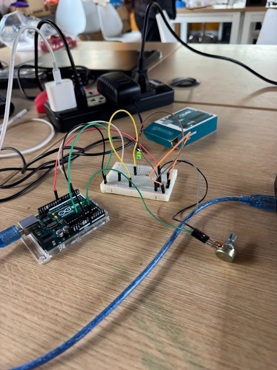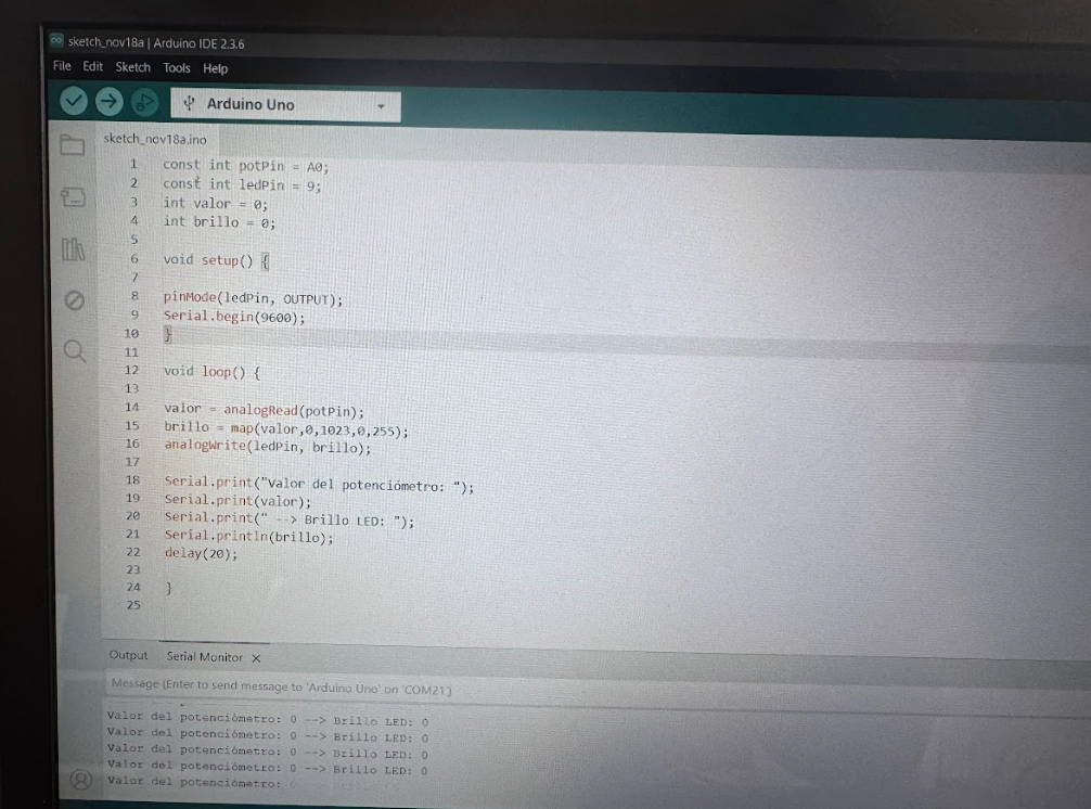 Cuando el potenciómetro esté en valores bajos, el LED debe estar tenue. Cuando el potenciómetro esté en valores altos, el LED debe brillar más fuerte.